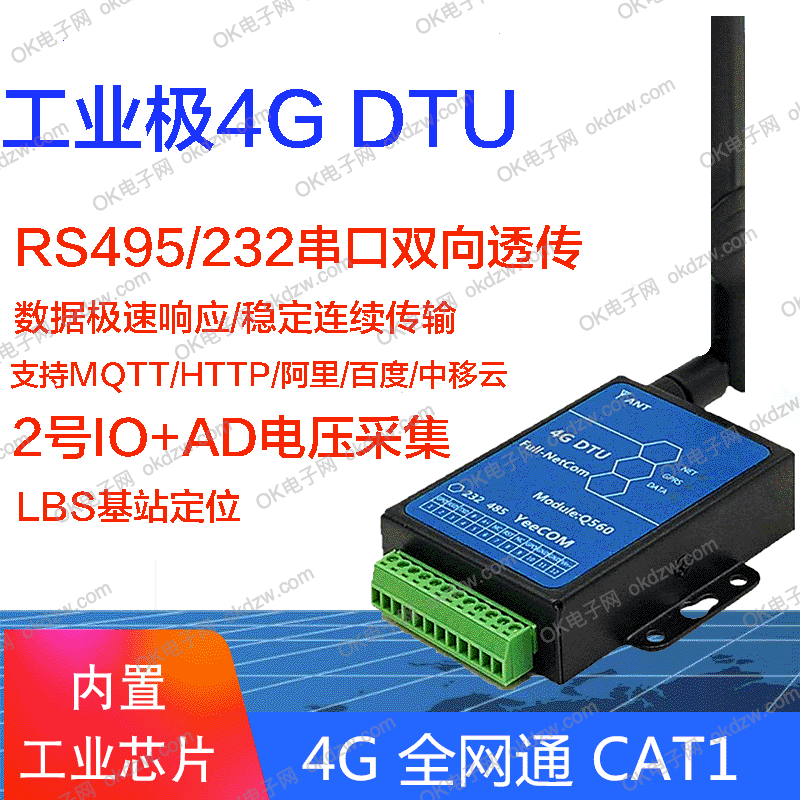 CAT1三网通4G DTU模块232+485串口透传MQTT阿里云轮旬Json全