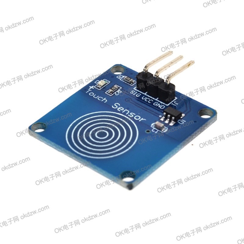 该模块是一个基于触摸电容式点动型触摸开关模块。常态下,模块输出低电平,模式为低功耗模式;当用手指触摸相应位置时,模块会输出高电平,模式切换为快速模式;当持续12秒没有触摸时,模式又切换为低功耗模式。可以将模块安装在非金属材料如塑料、玻璃的表面,另外将薄薄的纸片(非金属)覆盖在模块的表面,只要触摸的位置正确,即可做成隐藏在墙壁、桌面等地方的按键。该模块可以让你免除常规按压型按键的烦恼。