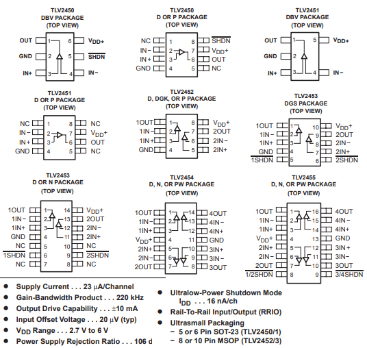 TI 德州仪器 TLV2452 双路微功耗轨至轨输入/输出运算放大器 PDIP|8, SOIC|8, VSSOP|8