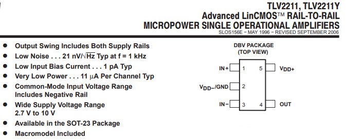 TI 德州仪器 TLV2211 单路 LinCMOS™ 轨至轨微功耗运算放大器 SOT-23|5