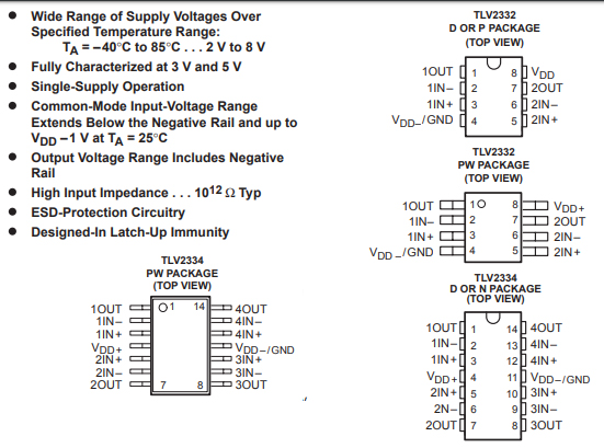TI 德州仪器 TLV2332 双路低电压低功耗运算放大器 PDIP|8, SOIC|8, TSSOP|8